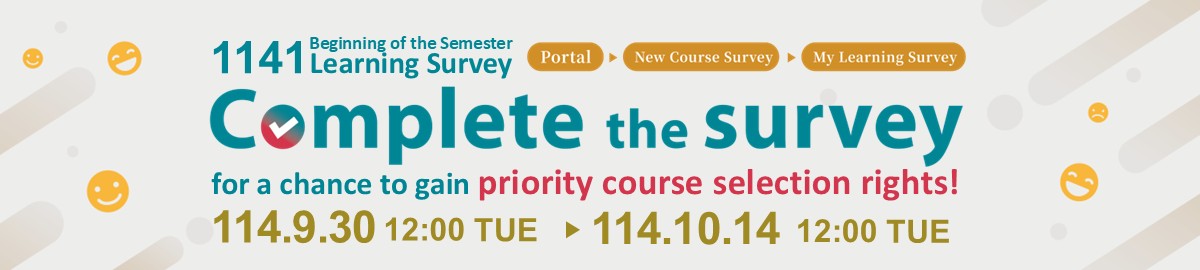 - 2025-09-26 【Announcement】1141 Beginning-of-the Semester Learning Questionnaire Starts from 12:00 PM on Sept. 30, 2025. Please log in to your personal Portal and actively participate in the survey!