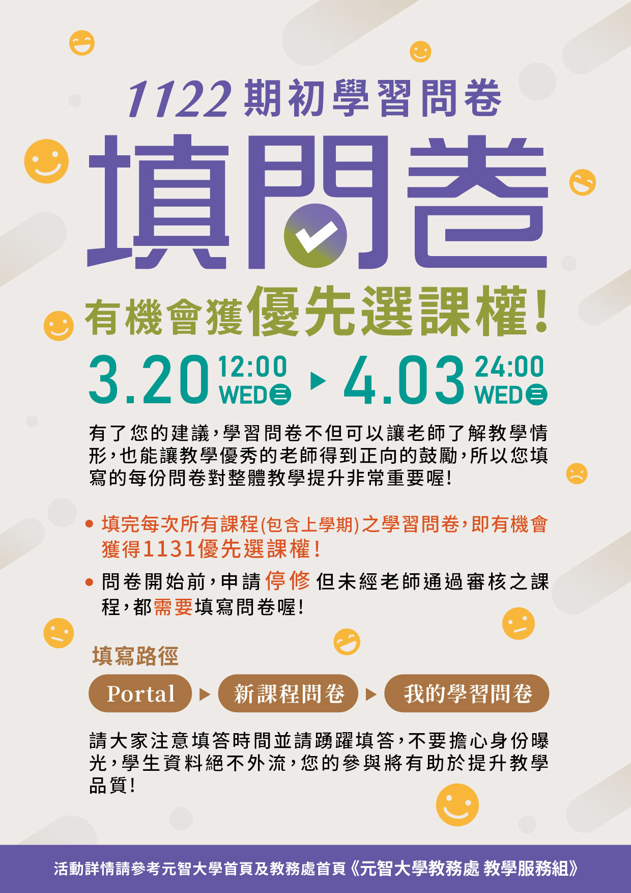 1122期初學習問卷調查已經開始囉!請大家注意填答時間並請踴躍填答喔!