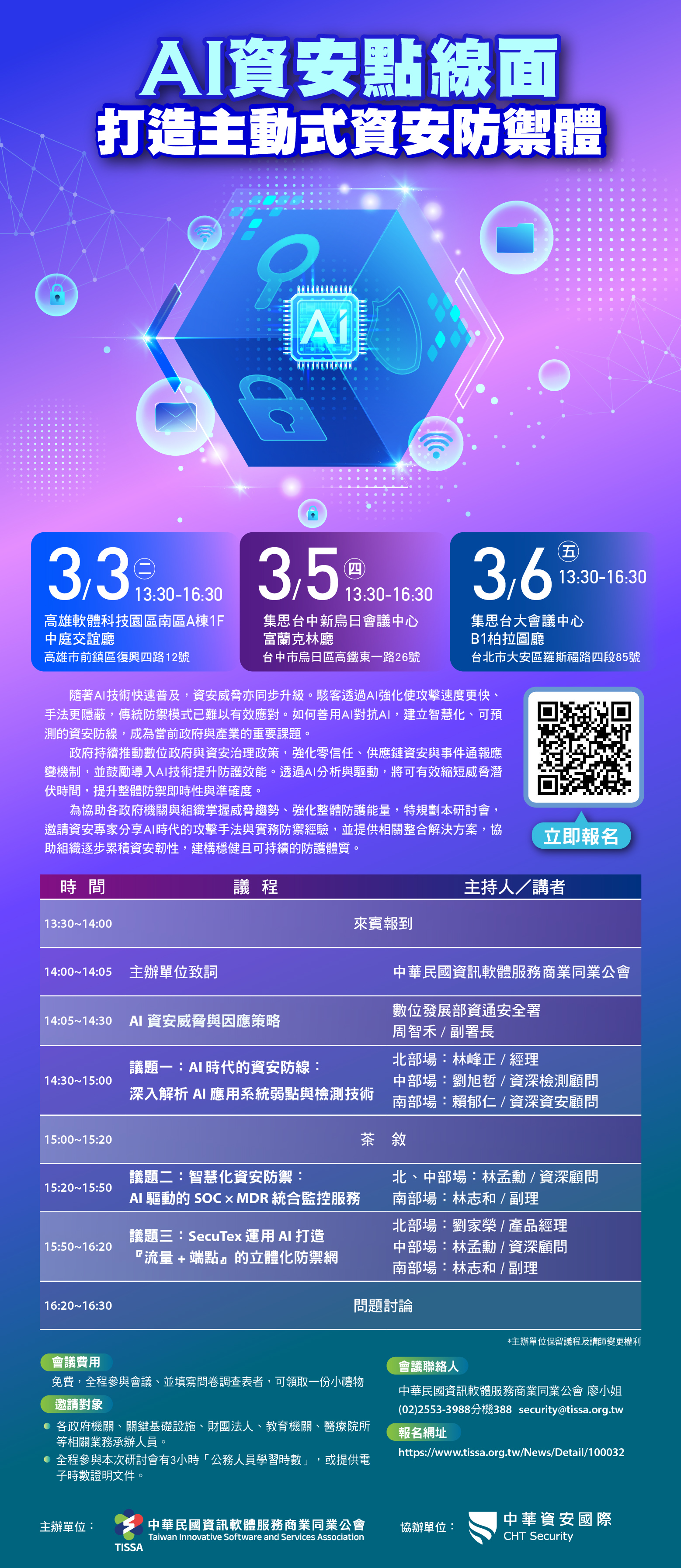 四、本次活動全程免費,並提供3小時公務員終身學習時數登錄(資通安全-通識),敬邀貴單位資訊、資安主管及專責人員報名參加,本次活動線上報名網址如下: https://www.tissa.org.tw/News/Detail/100032