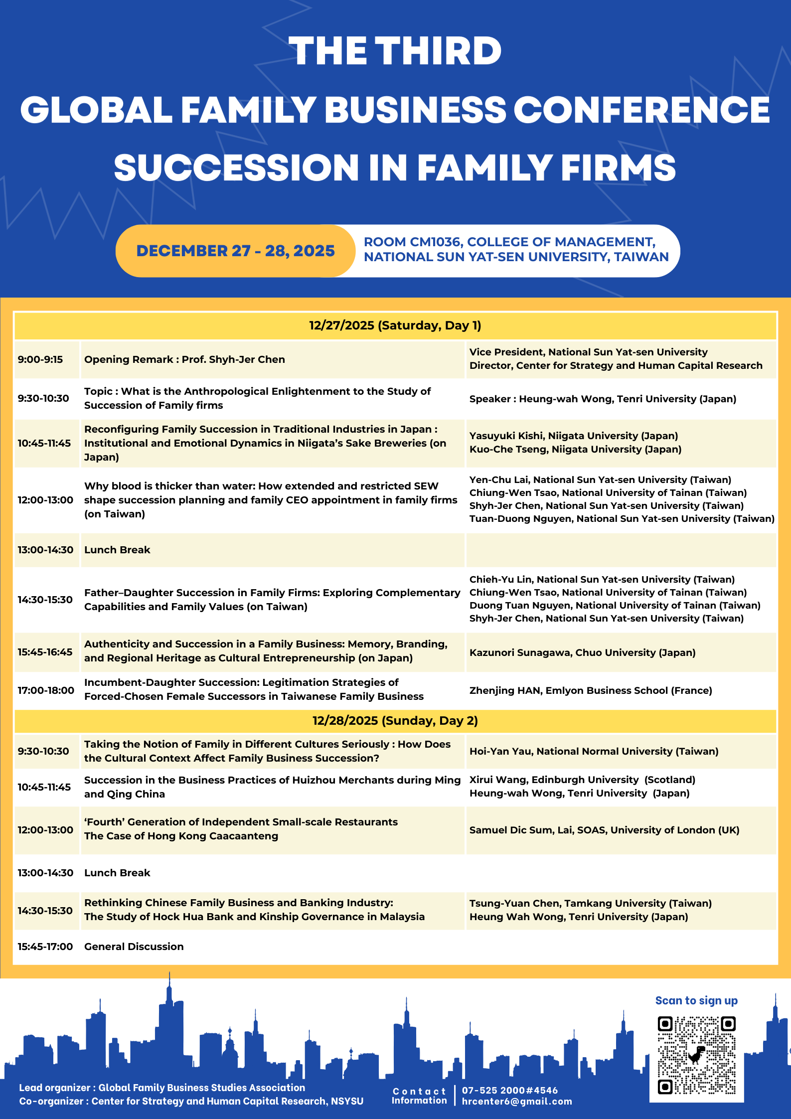 一、本活動為Global Family Business Studies Association 主辦,策略與人力資本研究中心協辦,第三屆「Global Family Business Conference」首次移師臺灣,聚焦「家族企業接班(Succession in Family Firms)」,活動邀集來自日本、英國、法國、馬來西亞及臺灣等國學者,內容涵蓋家族企業接班治理、女性接班議題、文化脈絡差異、區域品牌傳承與制度變遷等重要主題,期能促進家族企業研究、治理實務與跨國交流,活動全程將以英語進行。