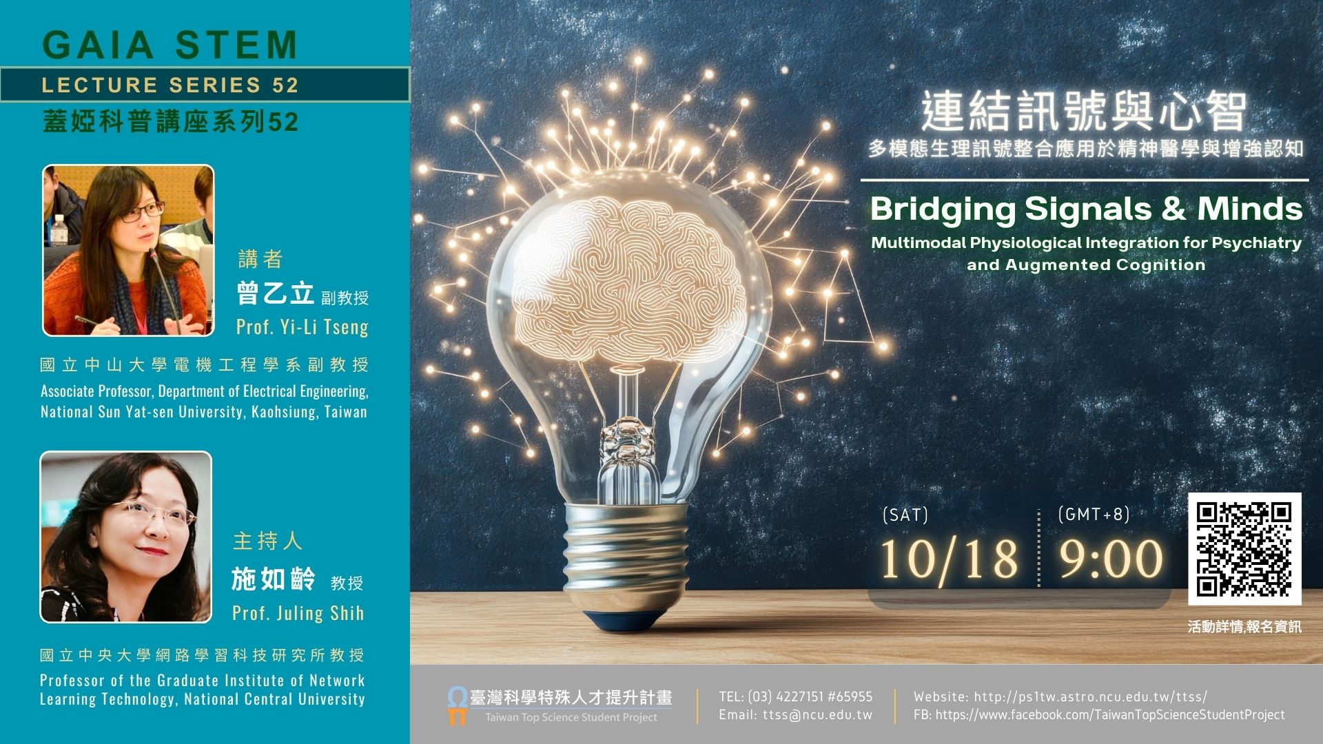 主旨:本校訂於114年10月18日辦理線上講座:《蓋婭科普講座系列 52》—— 「連結訊號與心智:多模態生理訊號整合應用於精神醫學與增強認知」,請惠予公告,並轉知貴校所屬師生踴躍報名參加,請查照。