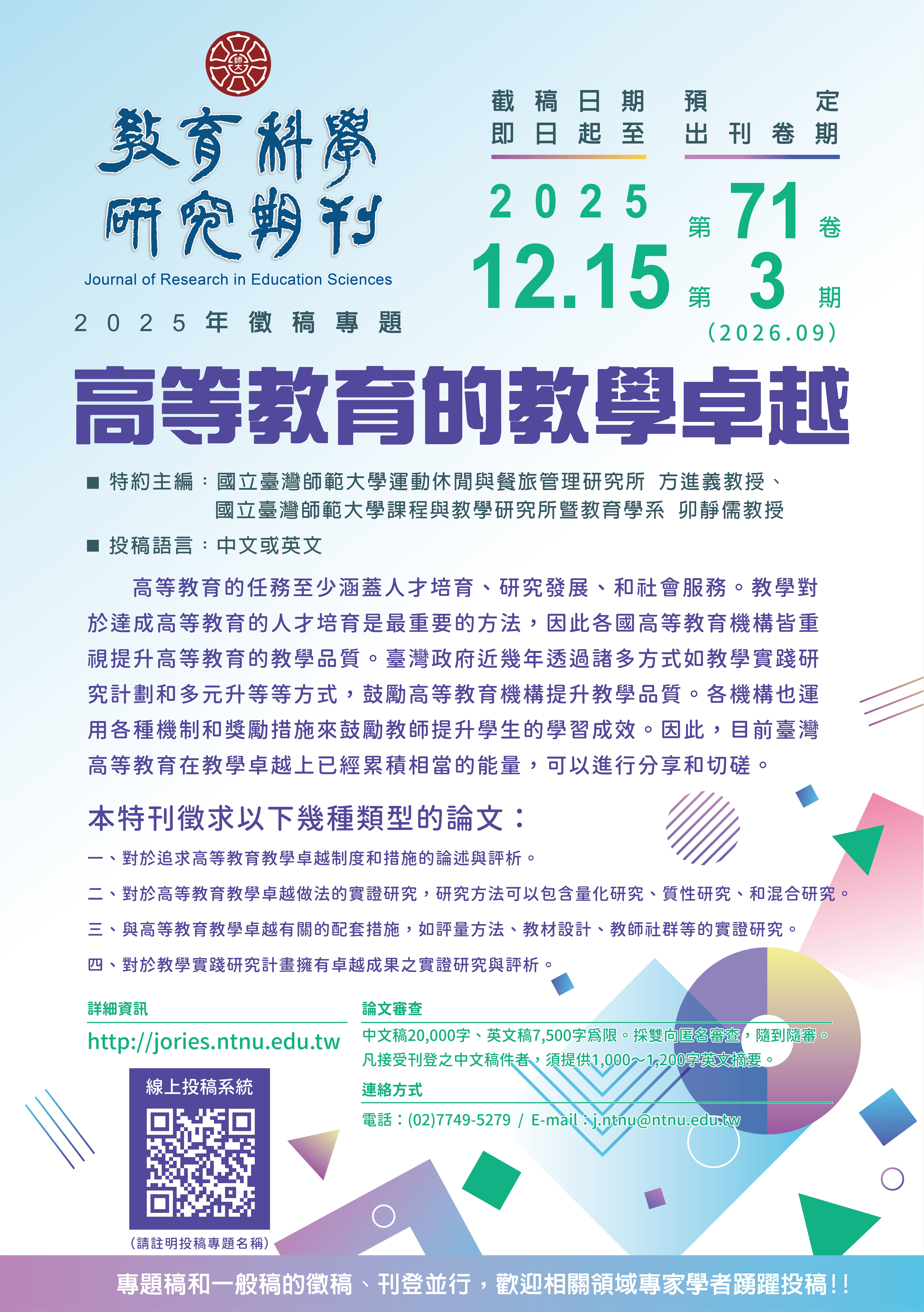 二、本刊自98年起由《師大學報:教育類》更名為《教育科學研究期刊》,旨在發表教育領域具原創性的研究論文,涵蓋範疇包括教學、學習與評量之原理、教育行政與政策,以及科學與技術教育等議題。