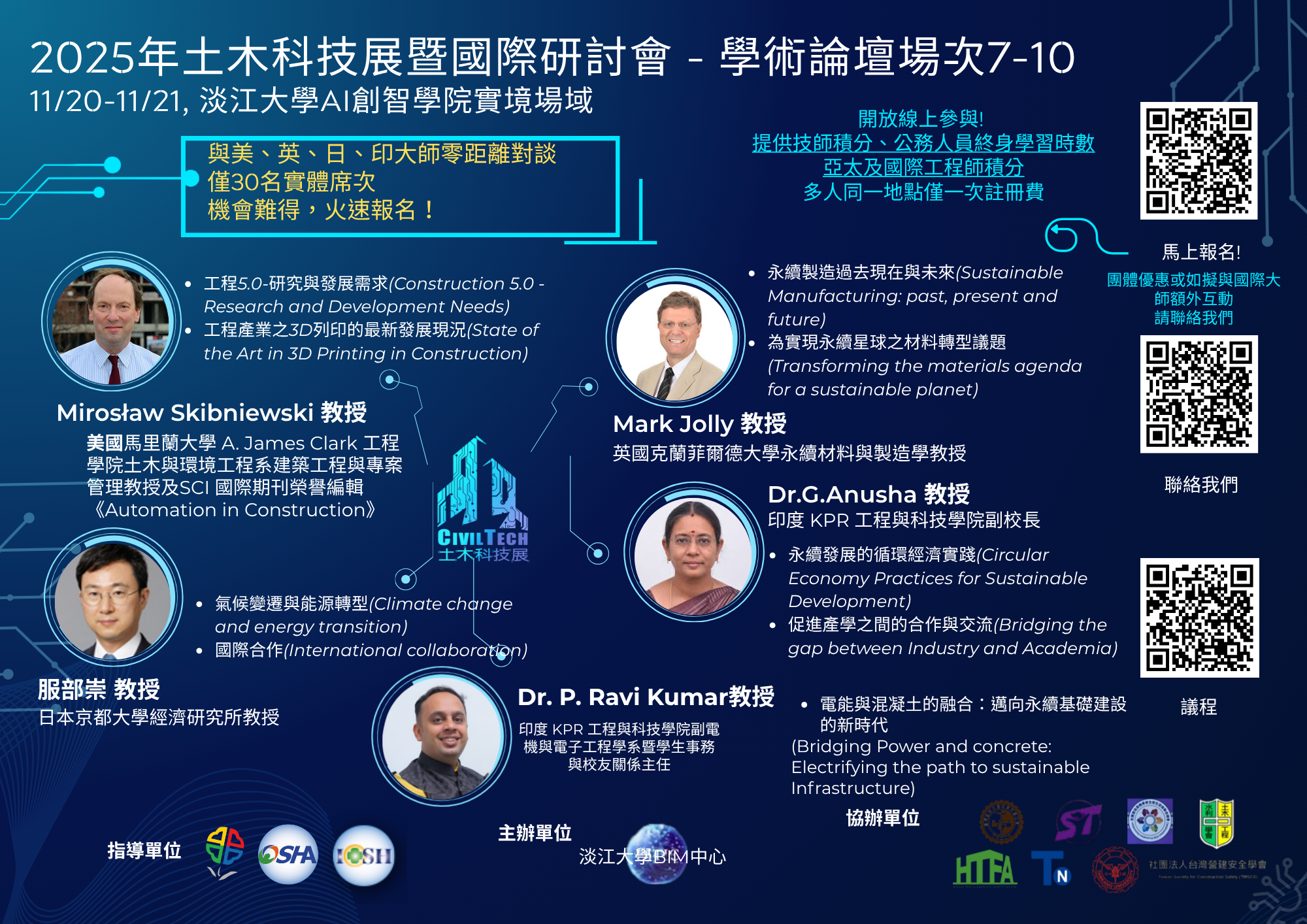 本校工學院工程資訊模擬與管理研究中心(BIM中心)訂於114年11月20日(星期四)至21日(星期五)在淡水校園AI 創智學院實境場域舉辦「學術論壇」,邀請美、 英、日、印4位國際級大師專題演講,實體席次僅30名, 另開放線上參加,並提供公務人員終身學習時數、技師、 亞太及國際工程師積分,請派員出席並協助轉發所屬,請查照。