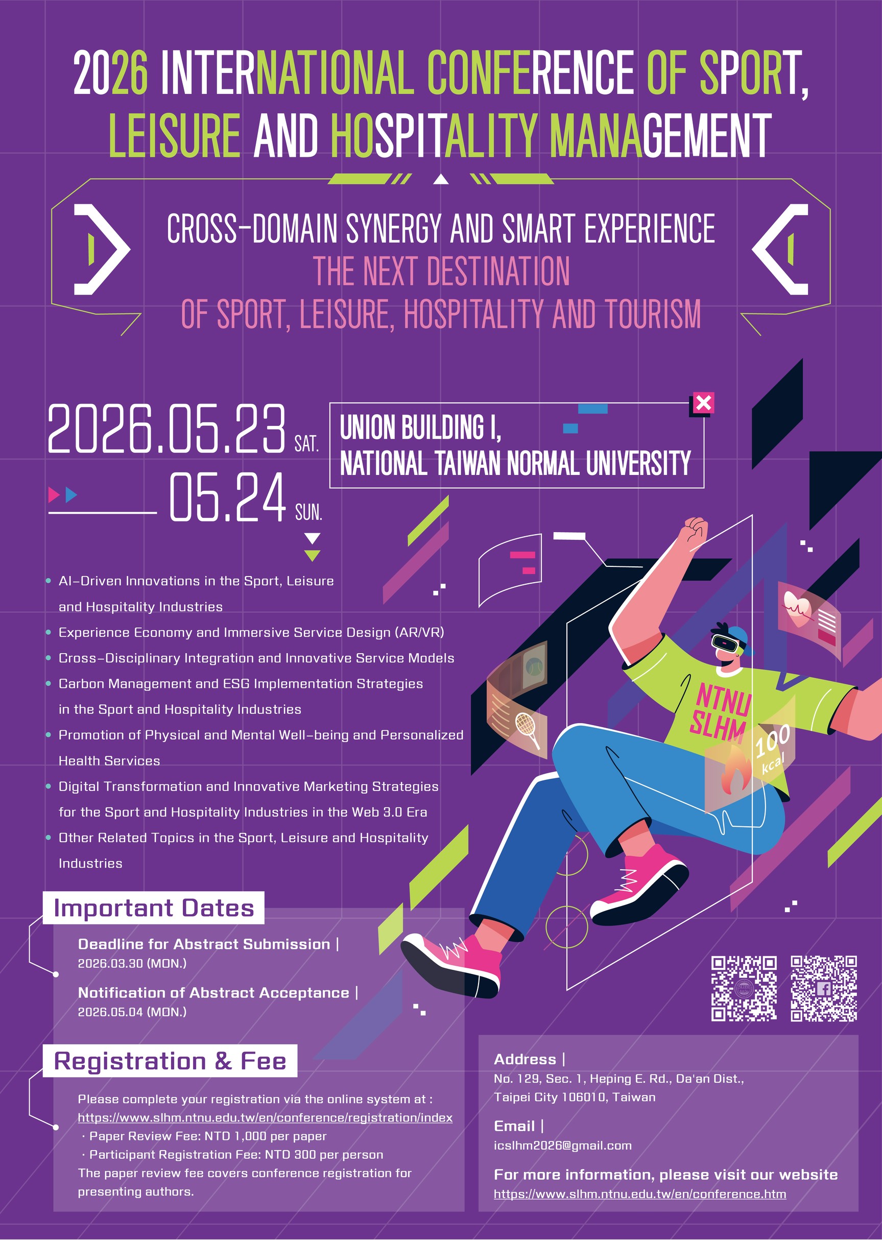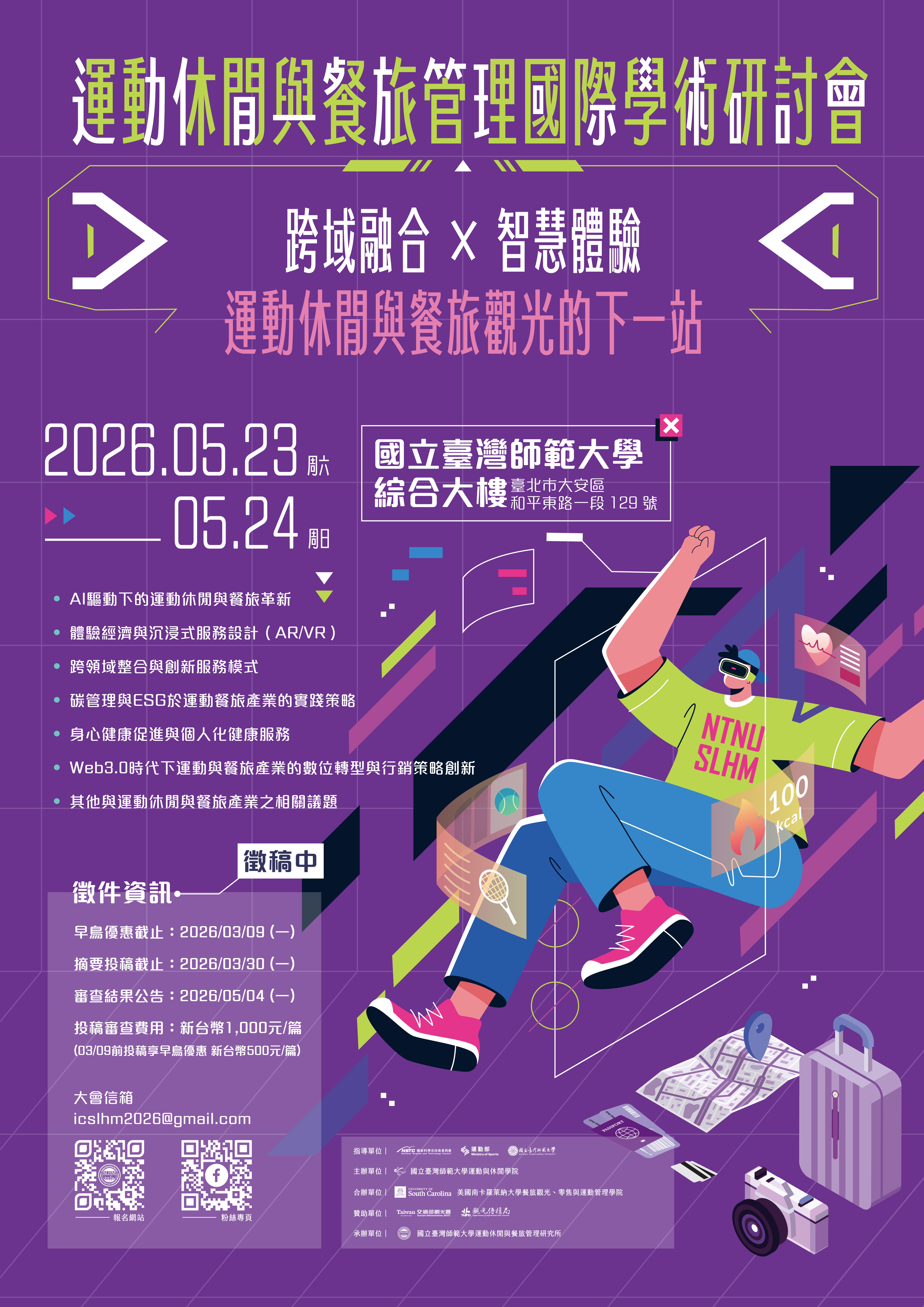主旨:本校謹訂於115年5月23日(星期六)至5月24日(星期日)於本校和平校區Ⅱ綜合大樓舉辦「2026年運動休閒與餐旅管理國際學術研討會」,主題為:跨域融合 × 智慧體驗: 運動休閒與餐旅觀光的下一站。檢送研討會海報與投稿須知,敬請惠予公告並鼓勵貴校師生踴躍投稿及報名參加, 請查照。