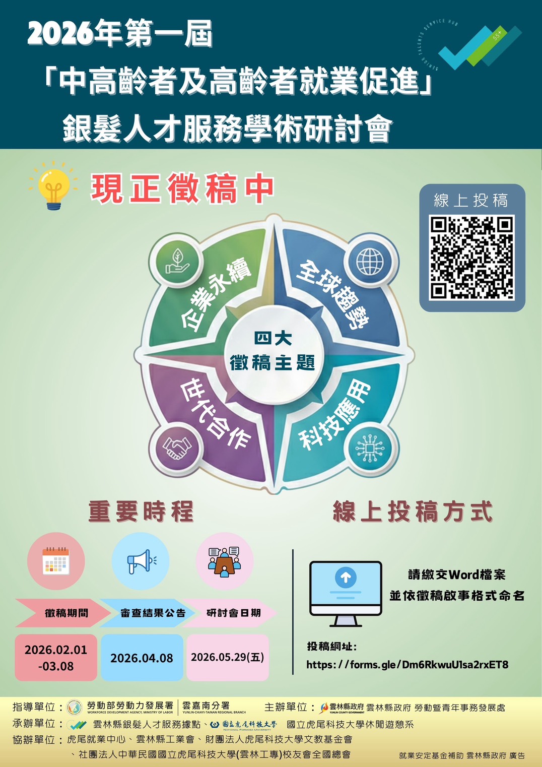主旨:檢送本校休閒遊憩系承辦「2026年第一屆中高齡者及高齡者就業促進銀髮人才服務學術研討會」活動資訊及海報 (如附件),敬請惠予協助公告並鼓勵踴躍投稿,請查照。