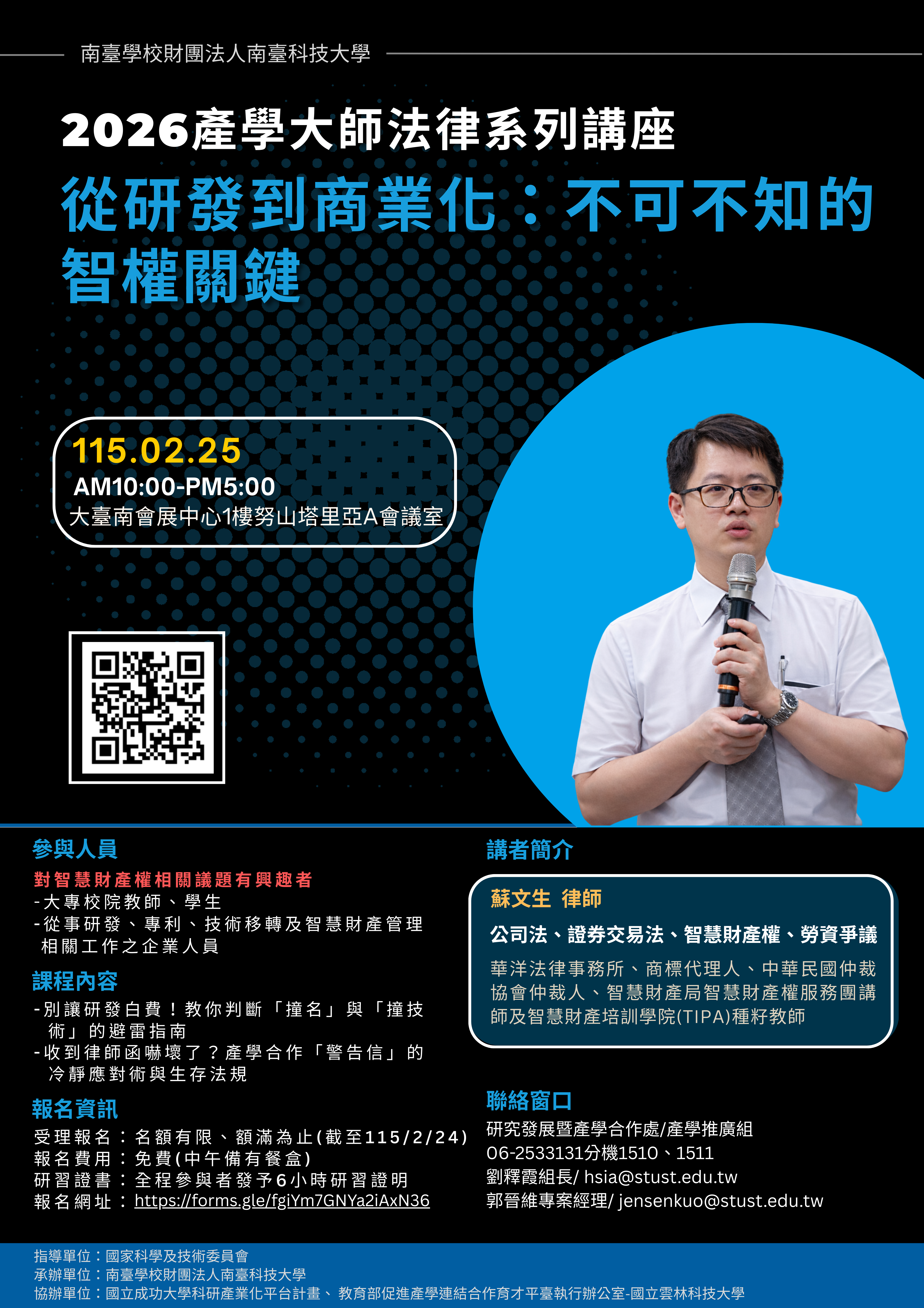 四、報名資訊:主旨:有關本校推動教育部育才平臺計畫,協助辦理南臺科技大學「2026產學大師法律系列講座-從研發到商業化:不可不知的智權關鍵」,敬邀貴校師生參與並協助公告,請查照。