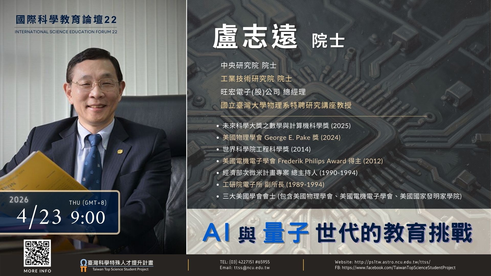 本校訂於115年4月23日辦理線上講座:《國際科學教育論 壇系列22》—— 「AI 與量子世代的教育挑戰」,請惠予公告,並轉知貴校所屬師生踴躍報名參加,請查照。