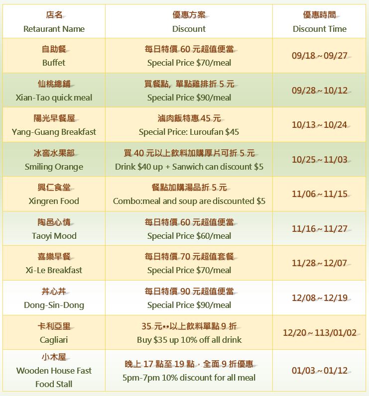 The guideline for food service is to provide inexpensive food meeting the standards of hygiene. All discounts provided by these cafeterias will be announced via e-mails.