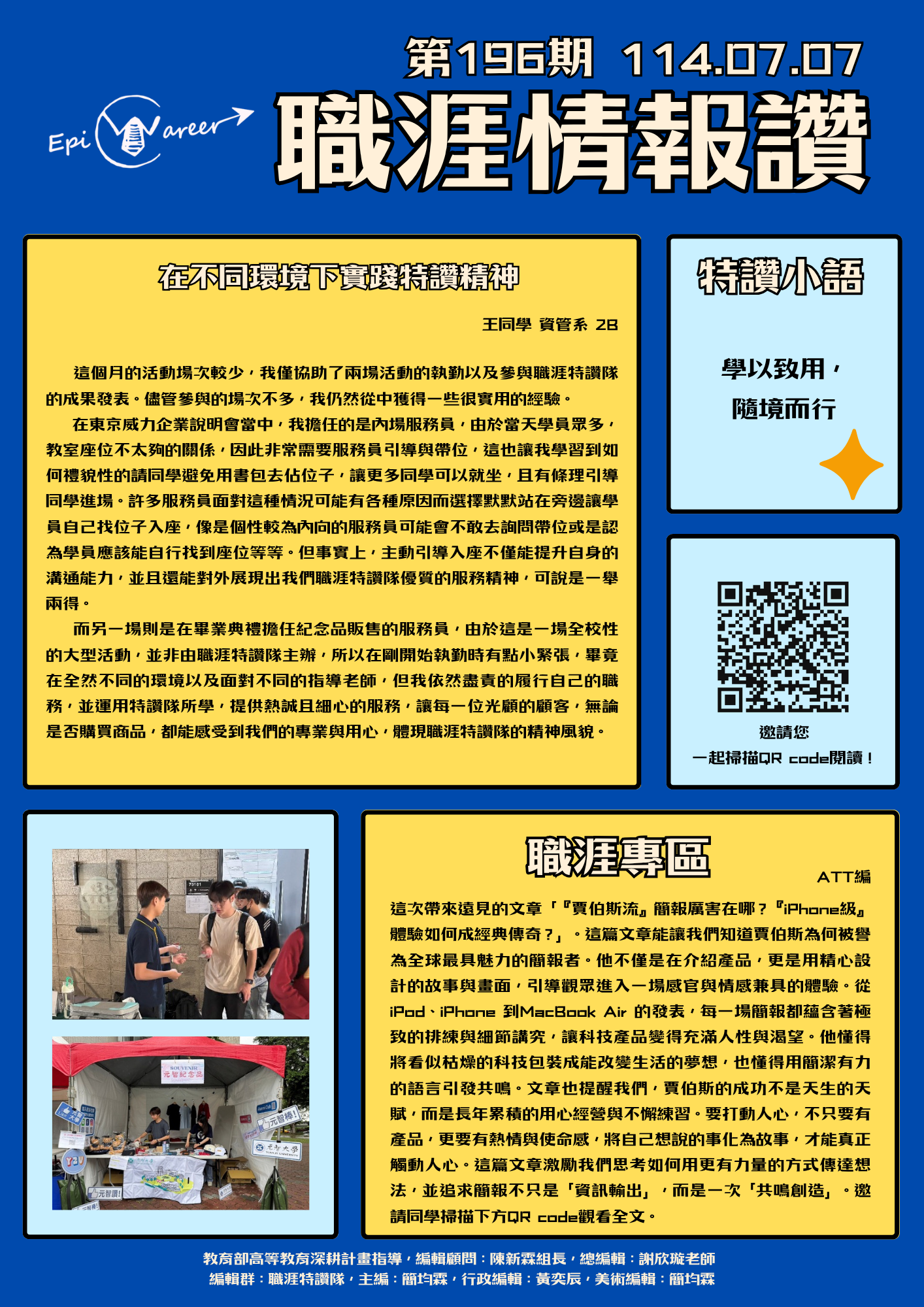 職涯情報讚196期1140707發行-資管系王同學-在不同環境下實踐特讚精神