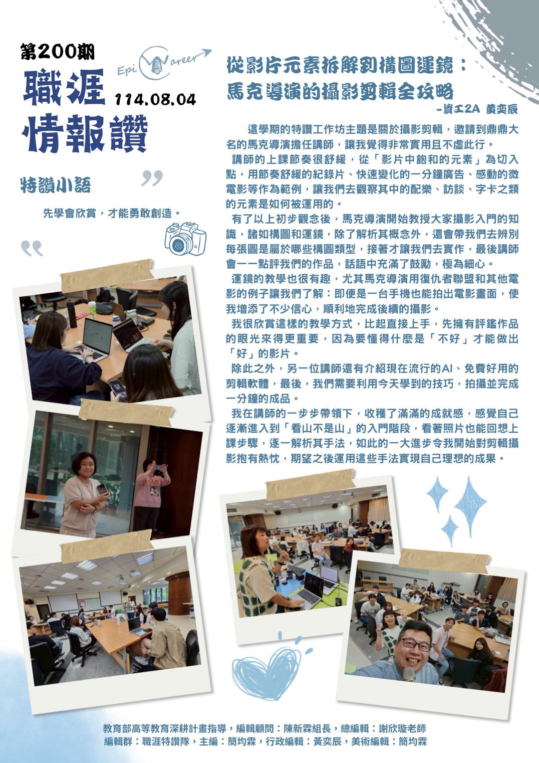 職涯情報讚200期1140804發行-資工二A黃同學-從影片元素拆解到構圖運鏡-馬克導演的攝影剪輯全攻略