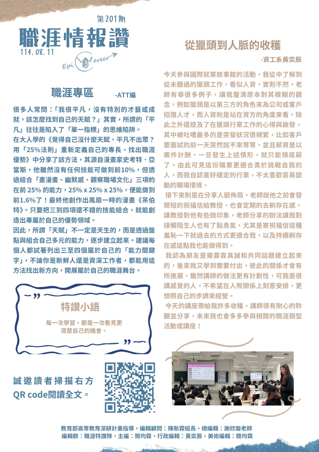 職涯情報讚201期1140811發行-資工系黃奕辰-從獵頭到人脈的收穫