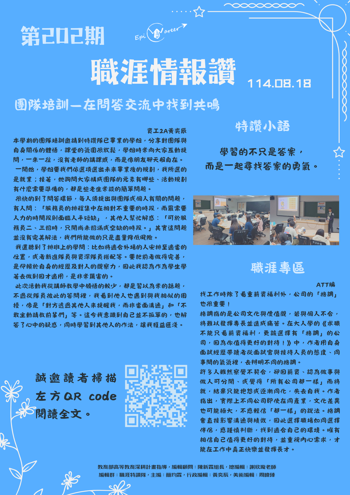 職涯情報讚202期1140818發行-資工系黃同學-團隊培訓,在問答交流中找到共鳴