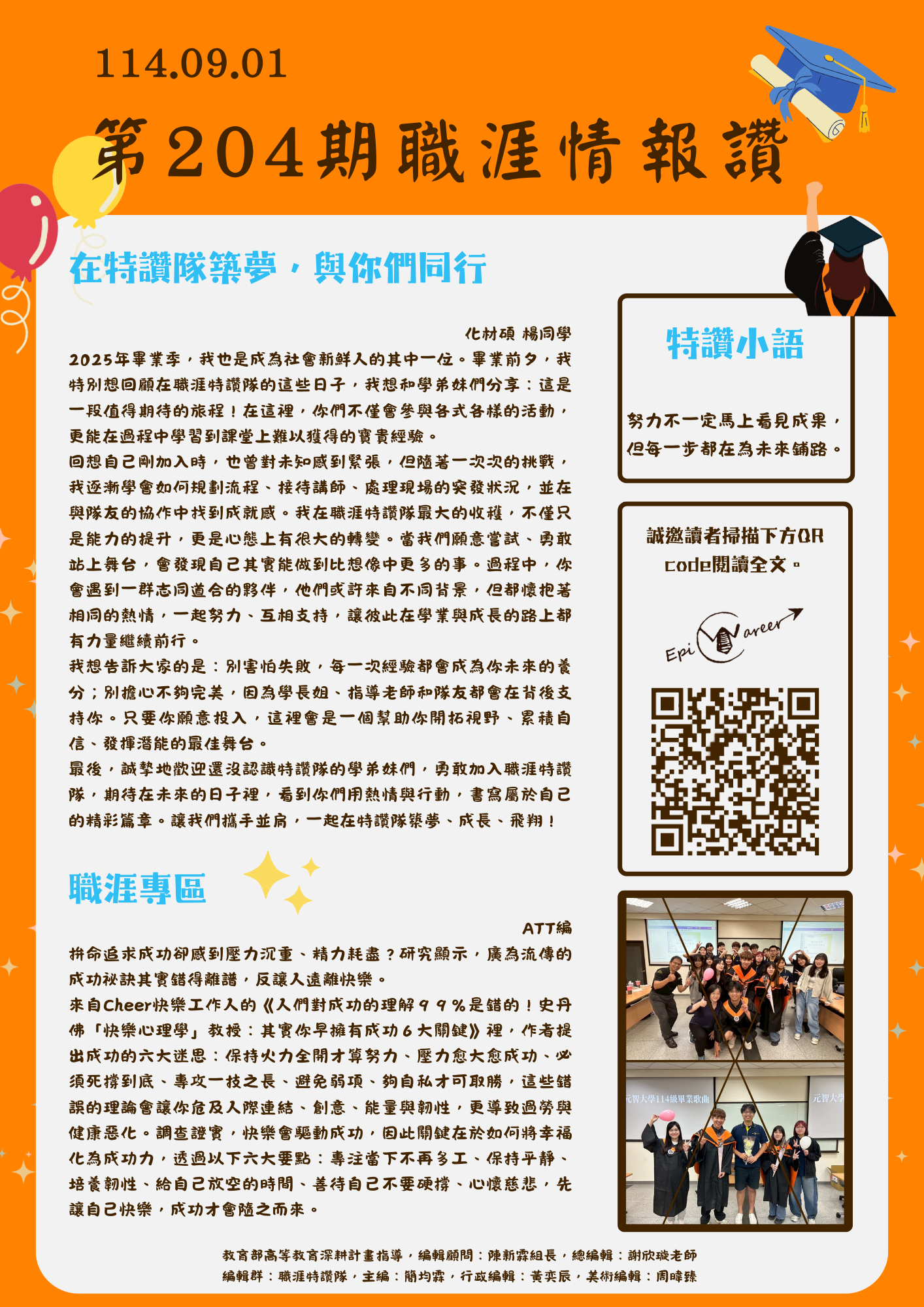 職涯情報讚204期1140901發行-化材碩楊同學-在特讚隊築夢,與你們同行
