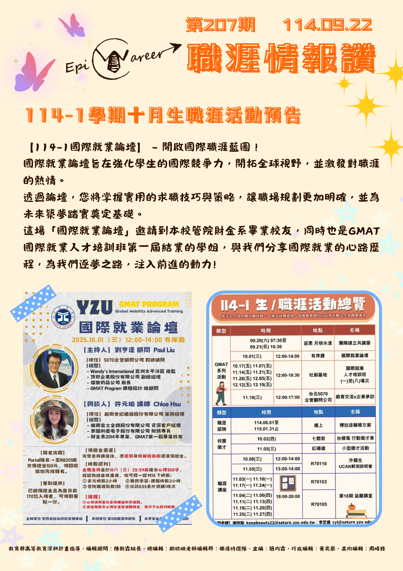 職涯情報讚207期1140922發行-114-1十月生職涯活動預告