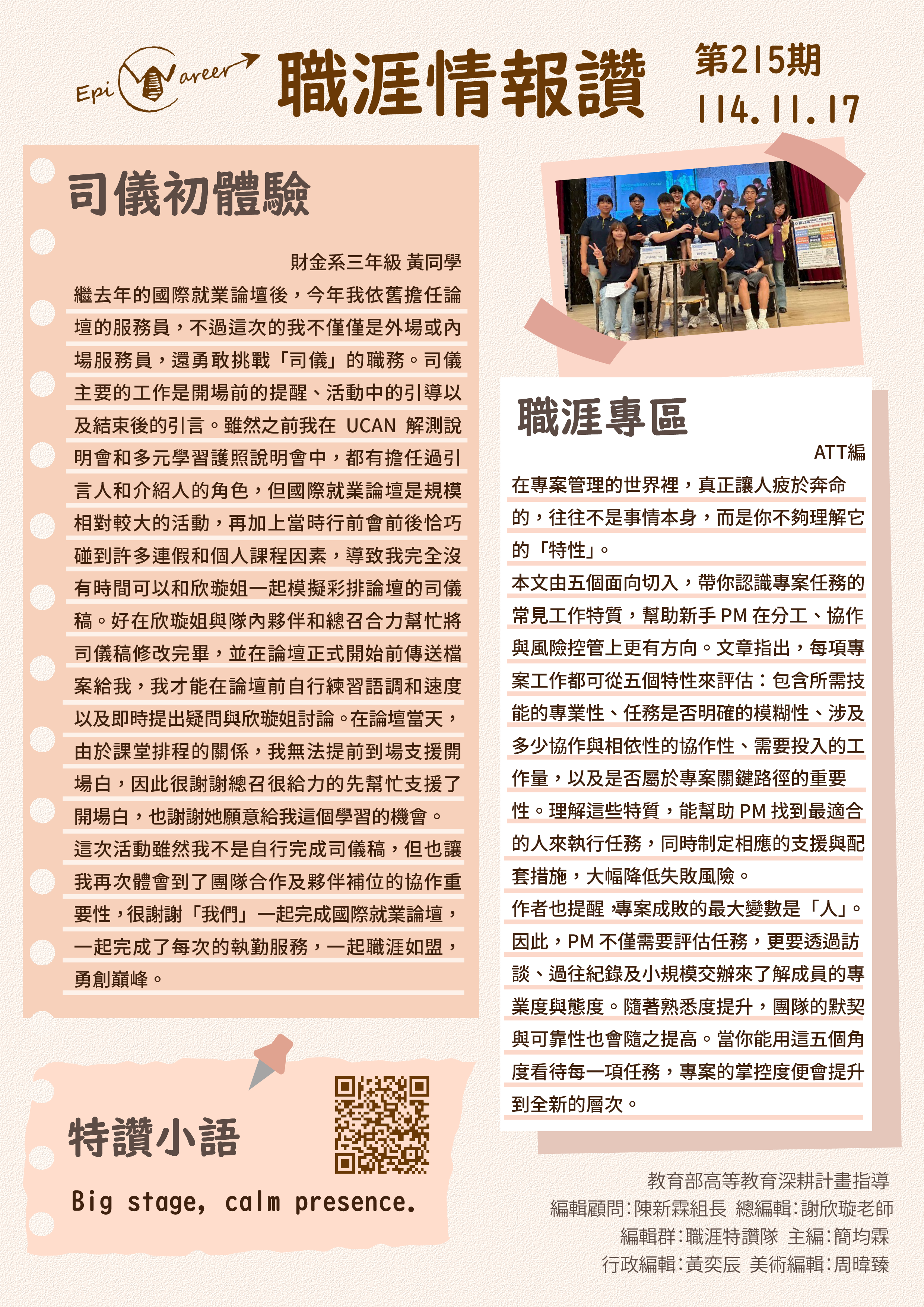 職涯情報讚215期1141117發行-財金系黃同學-司儀初體驗