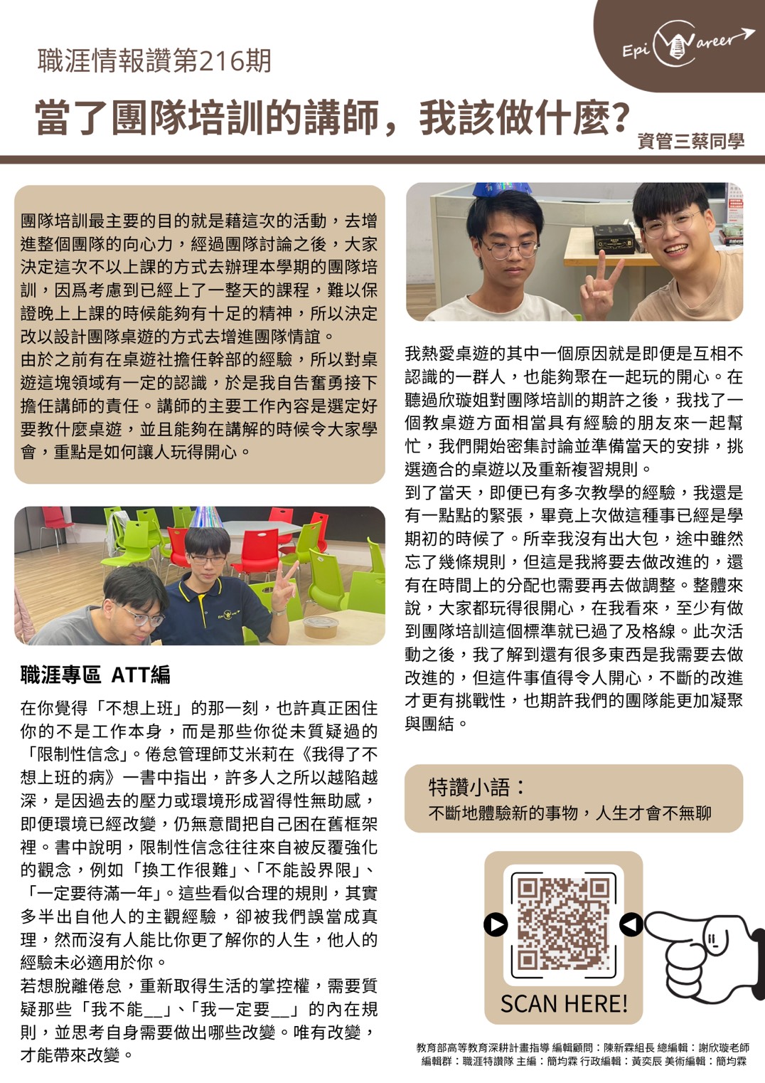 職涯情報讚216期1141124發行-資管系蔡同學-當了團隊培訓的講師,我該做什麼?