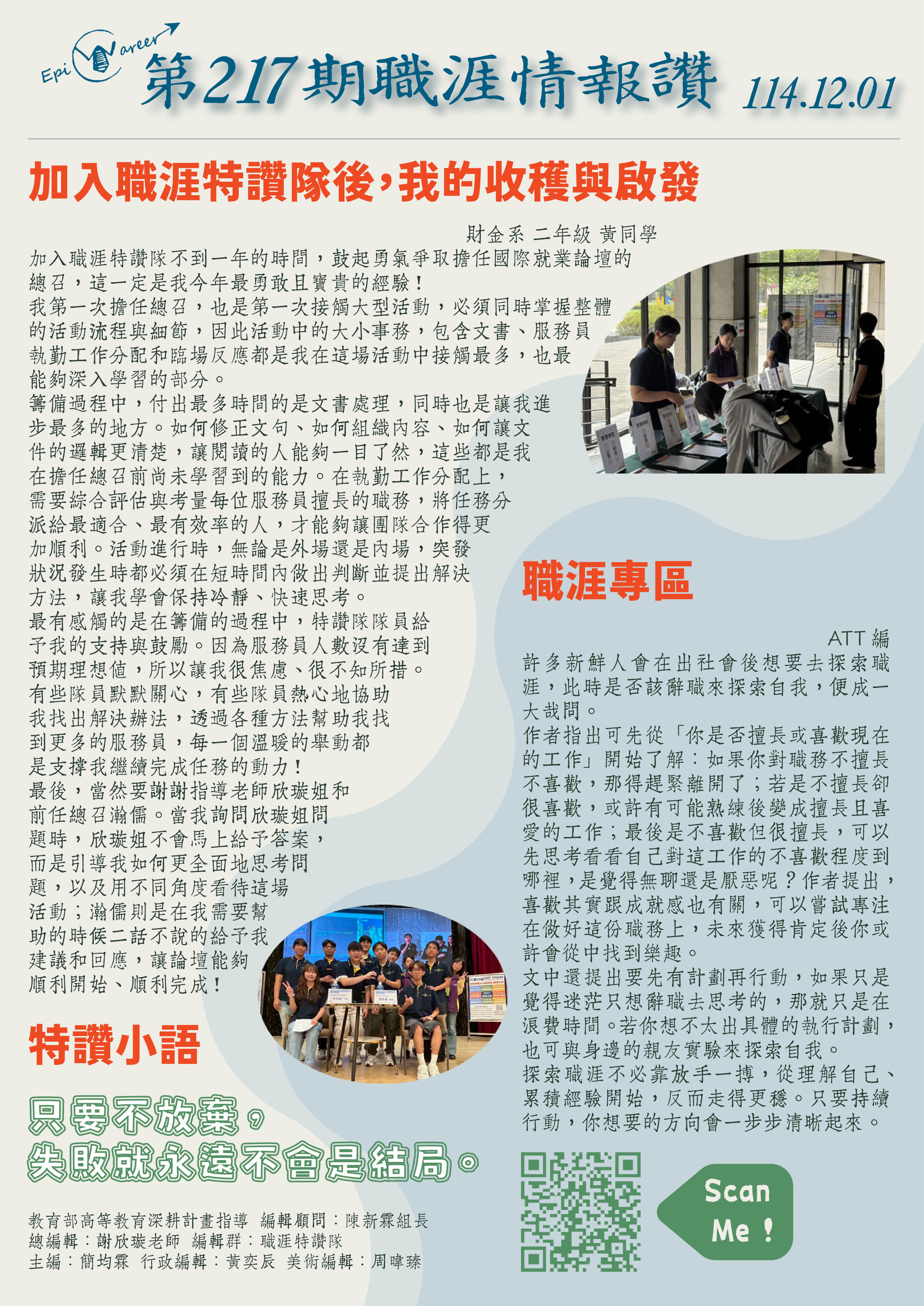 職涯情報讚217期1141201發行-財金系黃同學-加入職涯特讚隊後,我的收穫與啟發