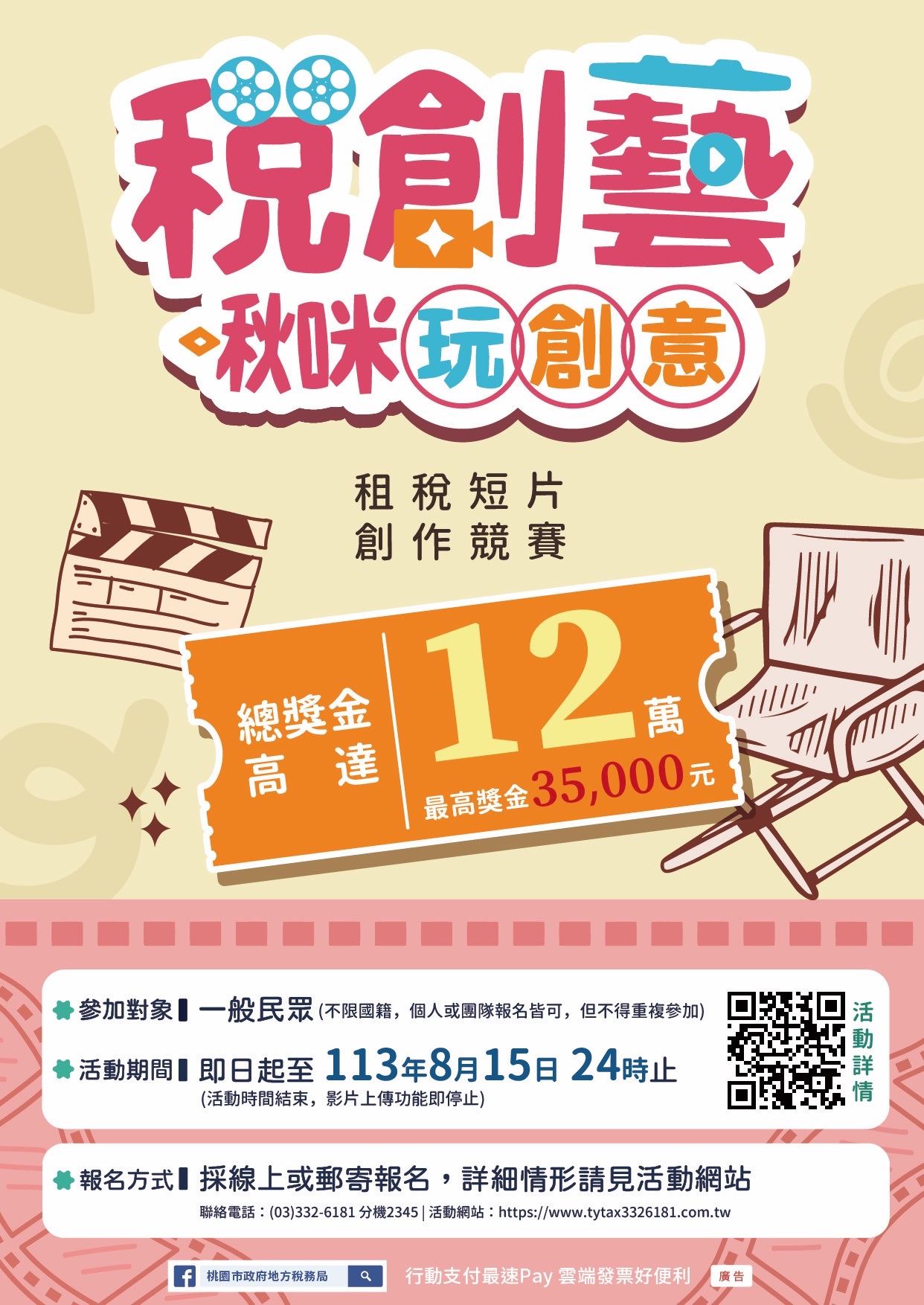 - 參賽作品時間以1至3分鐘為限(含片頭及片尾),畫面要有「作品主題名稱」、「旁白字幕(繁體中文)」,並請於片頭加入「桃園市政府地方稅務局113年結合統一發票推行辦理「稅創藝 啾咪玩創意」租稅短片創作競賽」字樣,並於片尾加註「廣告」。