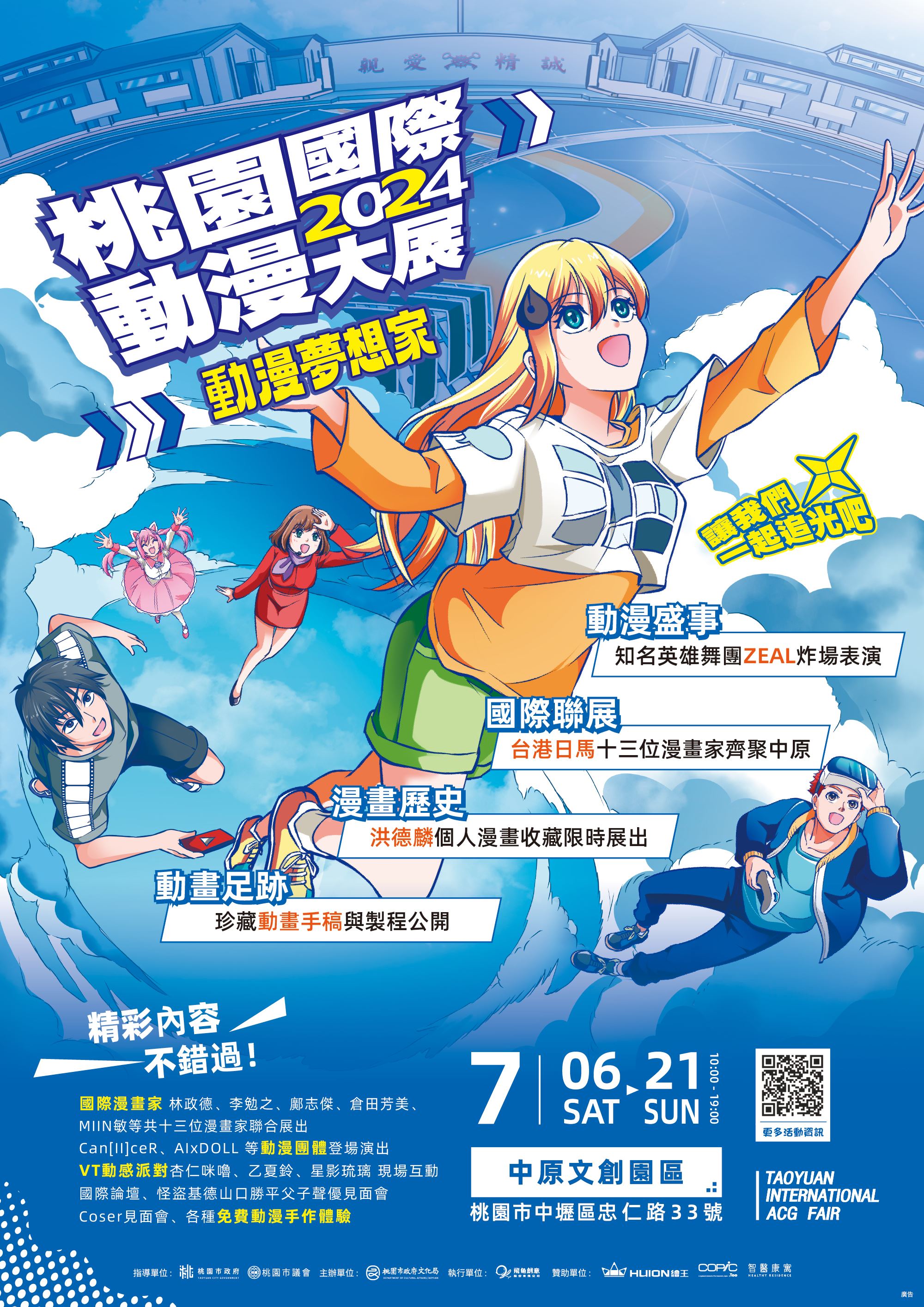 一、「2024桃園國際動漫大展」於113年7月6日至21日假中原文創園區辦理。今年主題為「動漫夢想家--讓我們一起追光吧!」期透過精彩作品帶大家看見超越國界、跨越文化追求夢想的精神,沉浸在動漫迷人的光彩中,對生活保有做夢、追夢的能量,找到屬於自己的亮光。