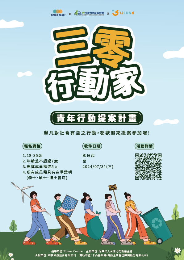二、本會長期培育大專院校學生投入公共事務參與,希望透過「三零行動家」青年行動提案競賽,培育18-35歲具有學士/碩士/博士在讀資格之青年從規劃到執行社會行動,促進青年發揮創新創意、連結國際人脈與探討社會與環境的問題(徵件截止日至2024/07/31(三)), 一同實踐2006年諾貝爾和平獎得主穆罕默德·尤努斯教授「零淨碳排放、零貧窮、零失業」的三零願景。