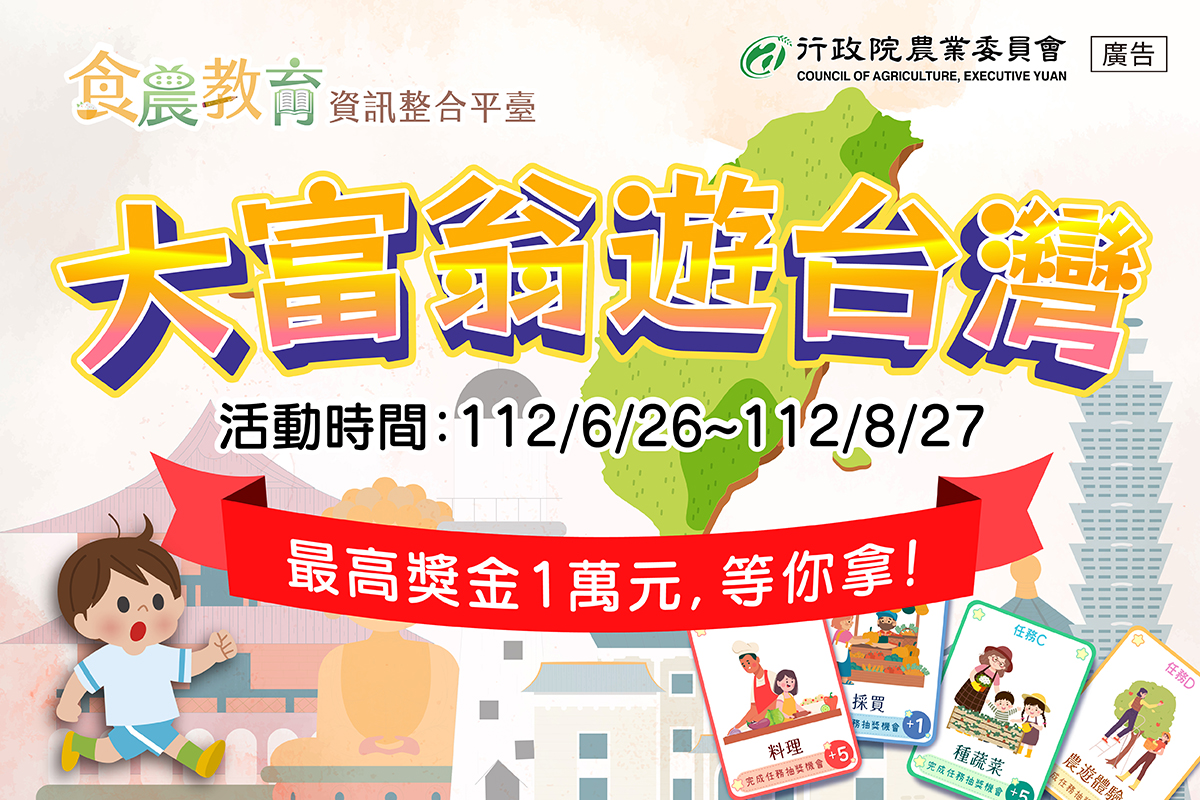 行政院農業委員會食農教育資訊整合平臺訂於112年6月26日至8月27日辦理「盛夏食農趣:大富翁遊臺灣」活動,總獎金超過10萬元。