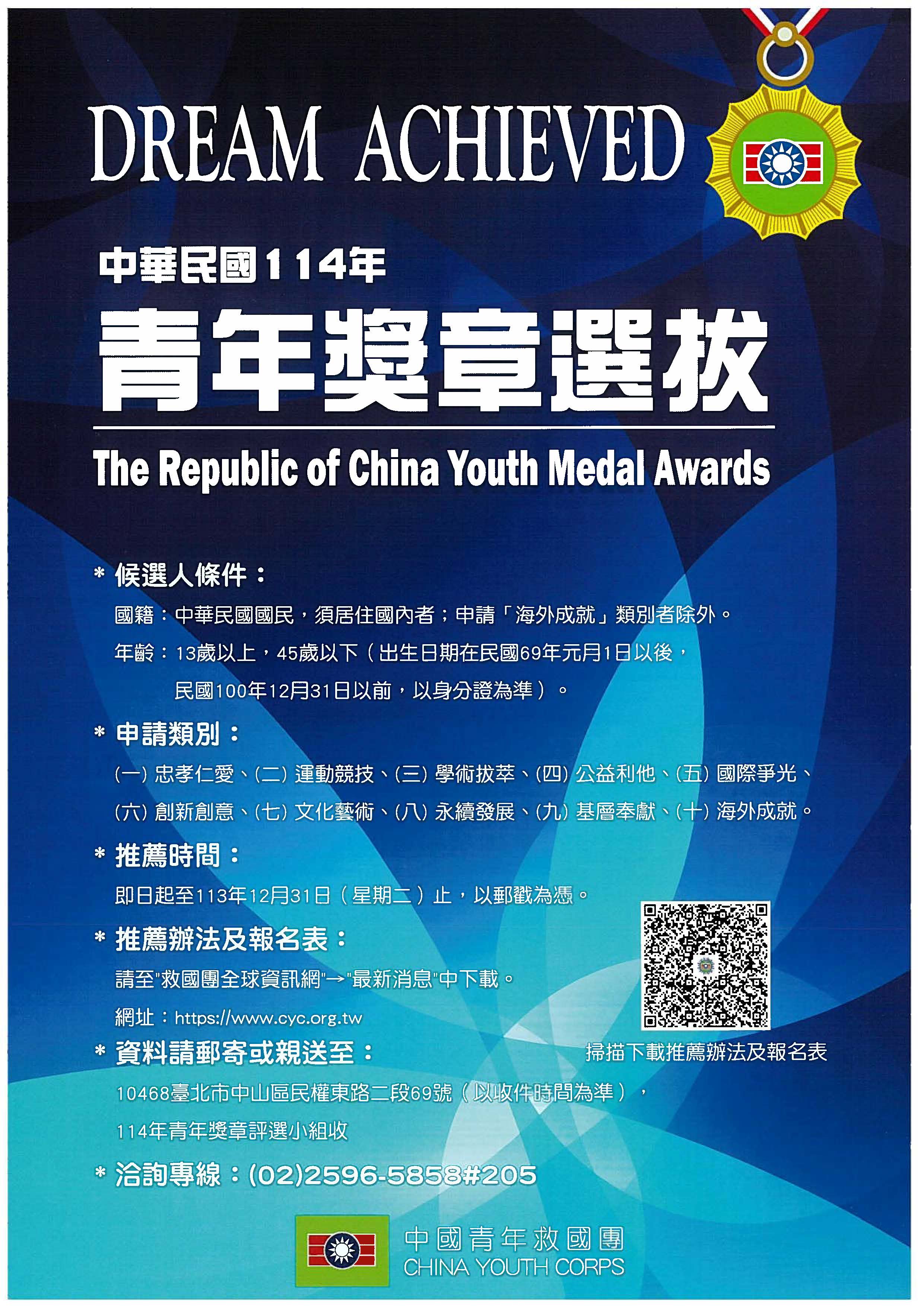 【課外組公告】「中華民國114年中國青年救國團青年獎章授獎辦法」,敬請各位優秀學生參加遴選。The Republic of China Youth Medal Award Regulations for the Year 113 of the Republic Era, inviting outstanding students to participate in the selection process.