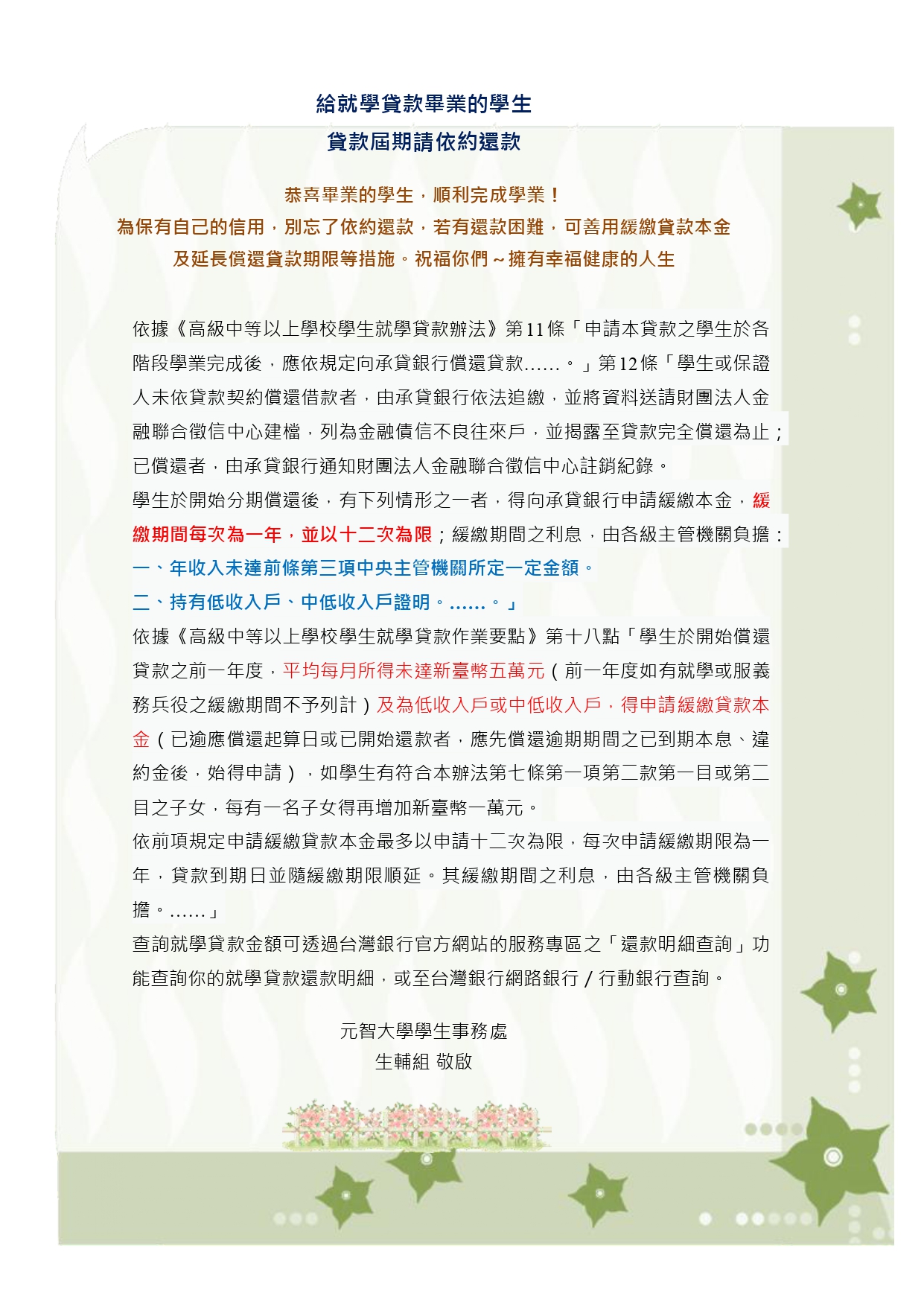【生輔組公告】應屆畢業生就學貸款還款注意事項