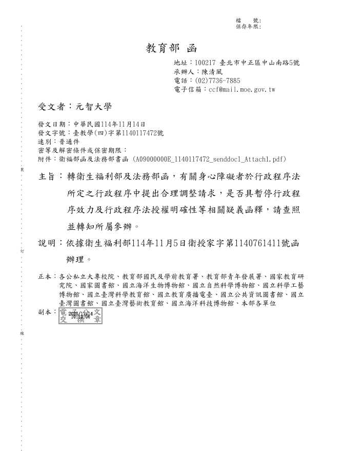 主旨:轉衛生福利部及法務部函,有關身心障礙者於行政程序法 所定之行政程序中提出合理調整請求,是否具暫停行政程 序效力及行政程序法授權明確性等相關疑義函釋,請查照 並轉知所屬參辦。 說明:依據衛生福利部114年11月5日衛授家字第1140761411號函 辦理