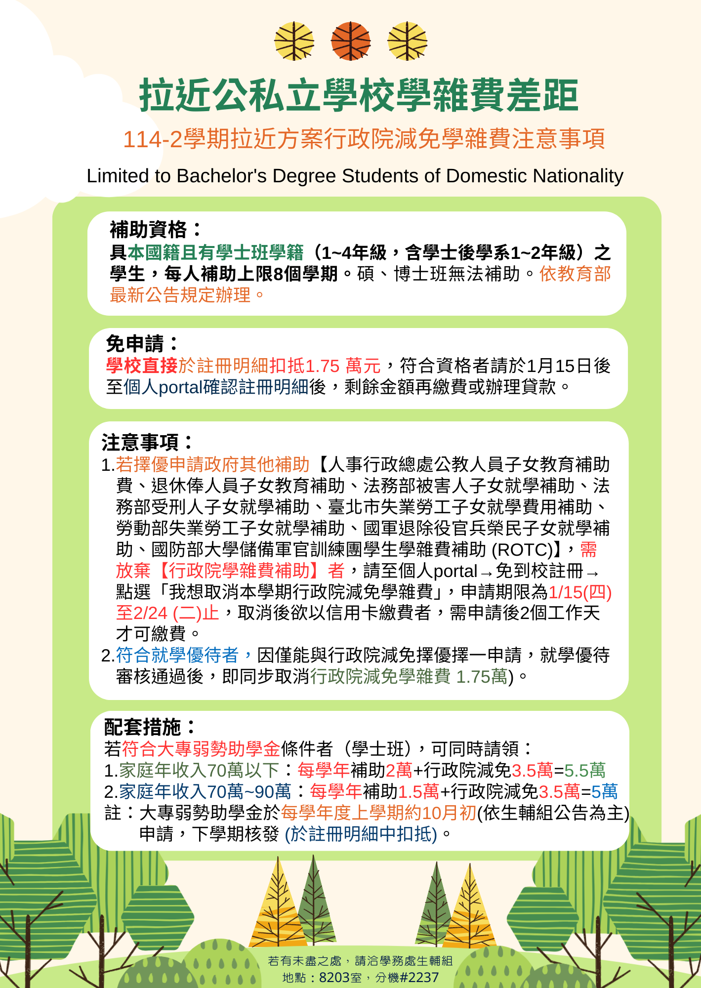 【生輔組公告】114-2學期拉近方案行政院減免學雜費注意事項