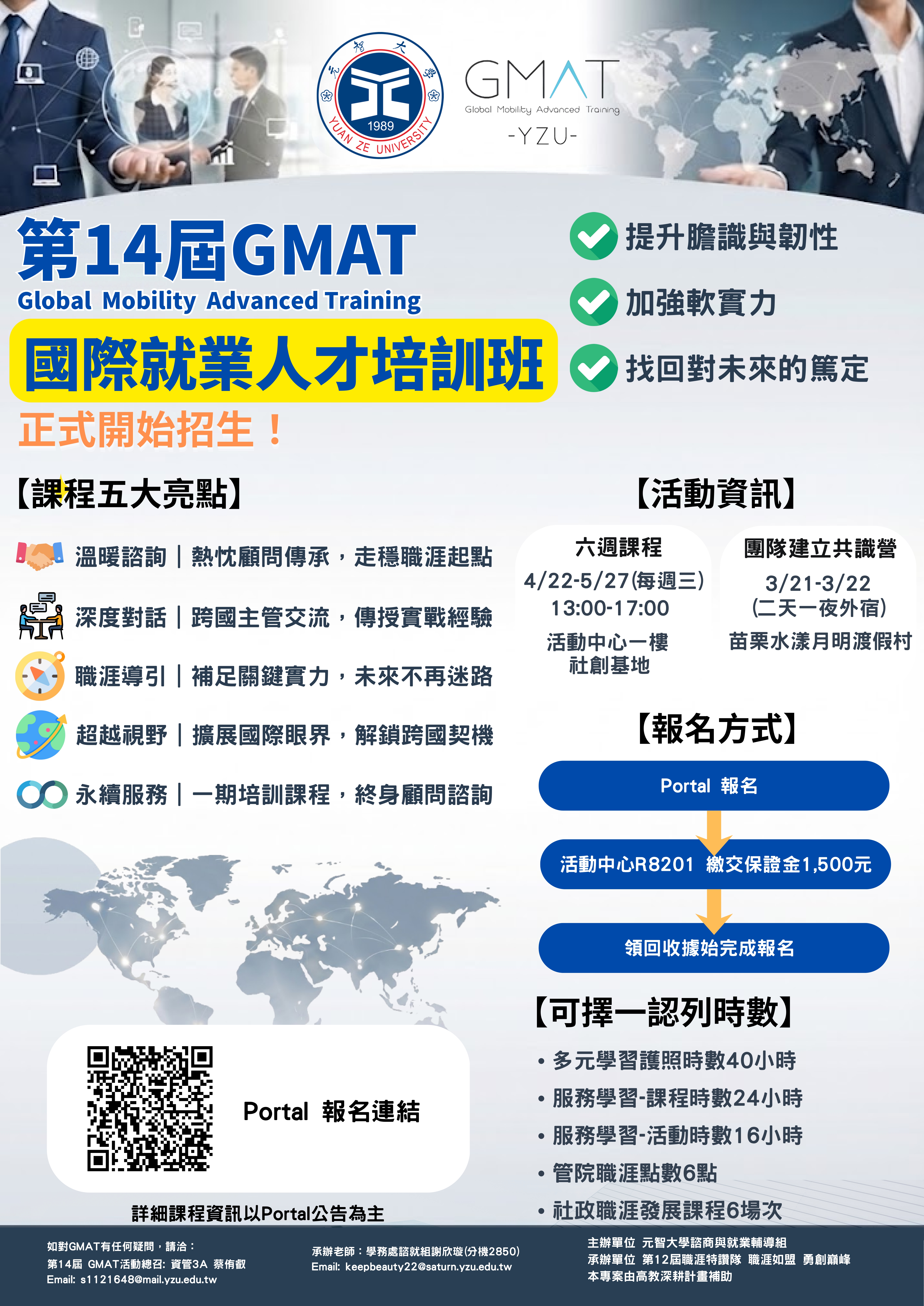 第14屆 GMAT Program國際就業人才培訓班,誠摯邀請您報名參加。
