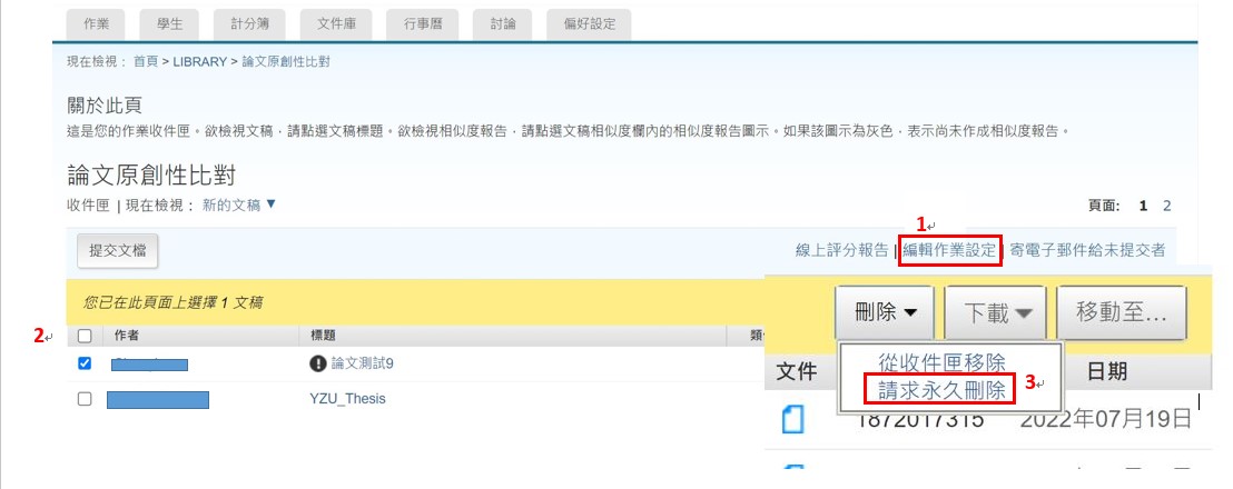 - 教師如「不慎設定為標準儲存庫」,上傳之論文儲存至系統, 請務必參考使用手冊→指導教師→Turnitin教師版_入門版【單元十、刪除文稿】→選擇請求永久刪除文稿,送出後將會由系統管理者進行刪除,此約需1-3個工作天。