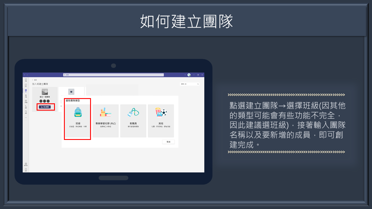 點選團隊裡的「開會」即可開啟課程,關閉時點選「離開」或「結束會議」,「結束會議」能夠使所有成員強制離開會議。